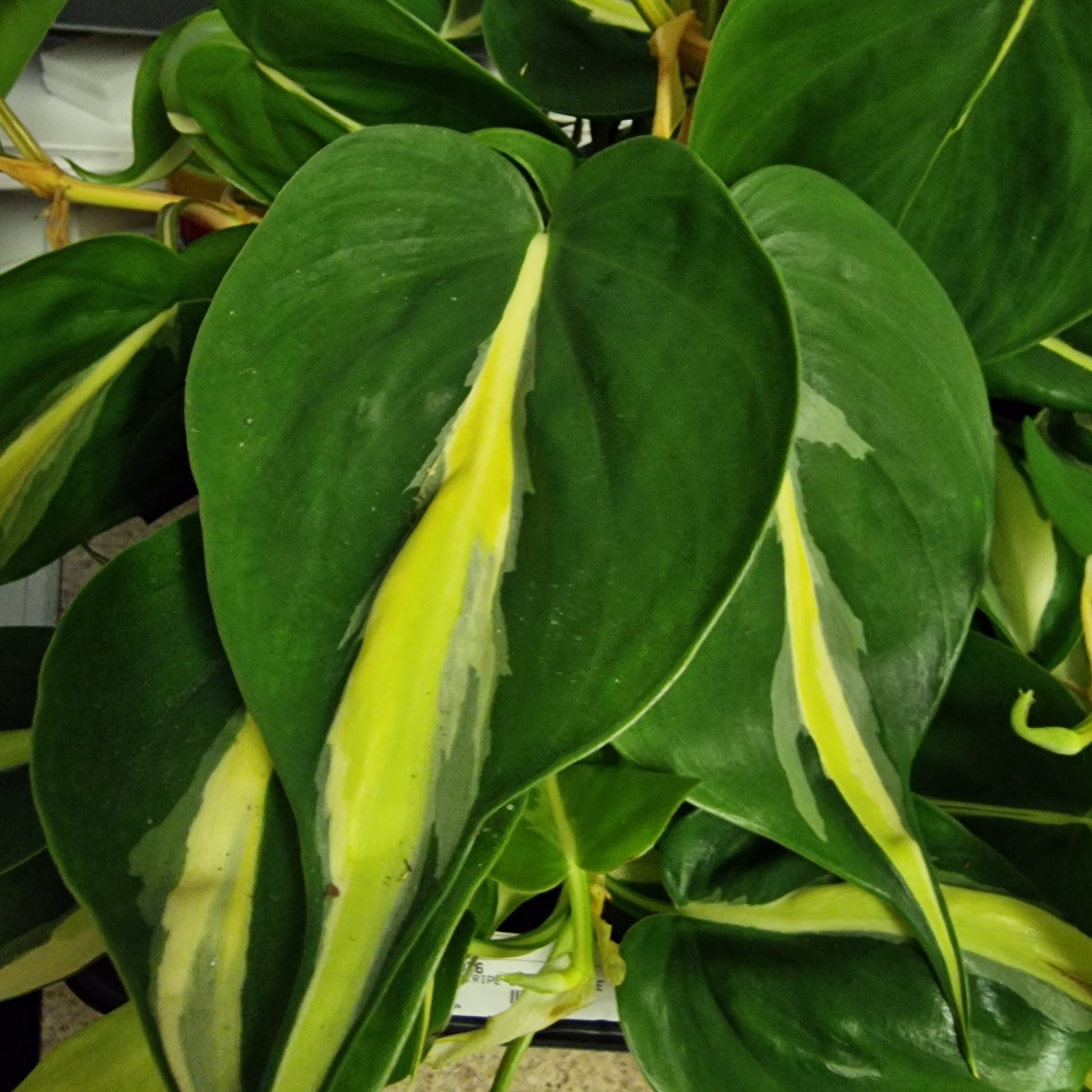 A gorgeous trailing Philodendron with heart-shaped leaves marked by creamy white, silver, and lime-green stripes down the centre — a true beauty in any collection! ✨